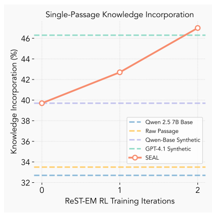 - SEAL: 사전 강화학습(RL)을 통해 self-edit 생성 정책을 학습한 모델