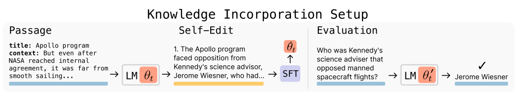 RL 학습을 통해 self-edit 생성 정책을 훈련시킨 후, 문단을 기반으로 self-edit를 생성하고,