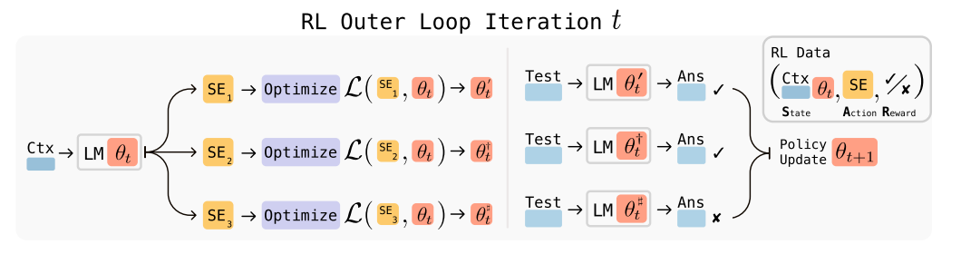 - 외부 루프(outer loop): self-edit 생성 정책을 강화학습으로 최적화