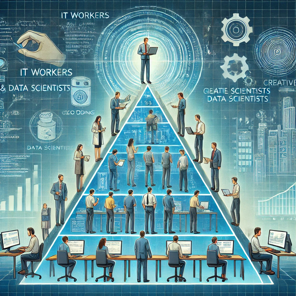 배경최근 한 글에서 흥미로운 가설을 제시한 내용을 접했습니다. 해당 글에서는 글로벌 시스템 통합 업체(SI)의 비(非)IT 부서의 젊은 인재들을 대상으로 한 질문에서 시작됩니다. 질문은 다음과 같았습니다:“비IT 부서에 속한 젊은 인재들이 IT 부서, 특히 오프쇼어 딜리버리 센터의 동료들보다 최고 경영진(MD) 자리에 오를 가능성이 더 높다고 생각하나요?”이 질문에 대해 비IT 부서의 인재들은 망설임 없이 “네”라고 대답했다고 합니다. 이를 통해 글의 저자는 “IT 직업이 지식 경제에서 블루칼라 직업이 되었다”는 가설을 확인하게 되었고, 데이터 과학자들 또한 동일한 방향으로 나아가고 있을 가능성이 높다고 주장합니다. 이 글에서는 이러한 주장의 맥락과 그 근거를 살펴보고자 합니다.인력 피라미드우선, “블루..